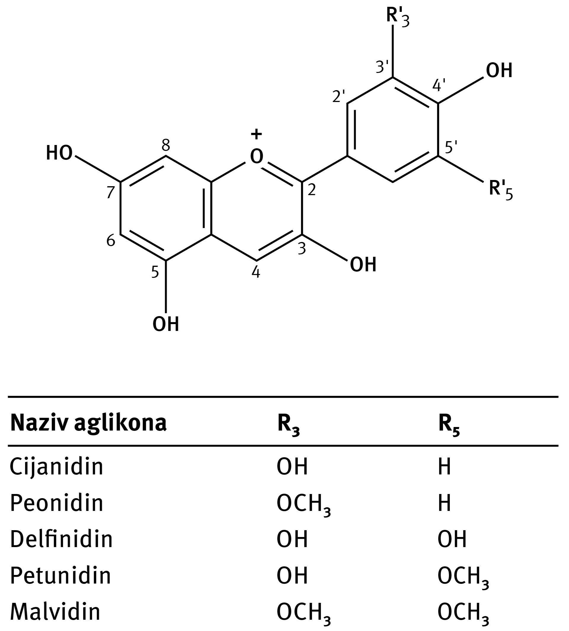Antocijani, fenolna jedinjenja odgovorna za boju grožđa crnih sorti vinove loze i crvenih vina. Locirani su uglavnom u → pokožici i, u malim količinama, u mesu i → listovima. Antocijani → maceracijom, u toku proizvodnje vina, prelaze u → širu i vino. Po hemijskoj strukturi pripadaju flavonoidnim fenolima, koje karakteriše osnovni skelet sa 15 C atoma (C6-C3-C6) tipa 2-fenil-benzopiran. Postoje aglikonske i glikozidne forme antocijana. Aglikoni su poznati pod nazivom antocijanidoli ili antocijanidini i zbog svoje nestabilnosti nijesu nađeni u grožđu i vinu. Na osnovu rasporeda i položaja hidroksilnih grupa na B prstenu, postoji pet aglikona, koji se razlikuju po stepenu hidroksilacije i metilacije sa dva ili tri supstituenta (OH ili OCH3): cijanidin (Cj), peonidin (Pn), delfinidin (Df), petunidin (Pt) i malvidin (Mv). U antocijane spadaju samo glikozidne forme, tj. glikozidi polihidroksilovanog i/ili metilovanog flavilijum prstena i mnogo su stabilniji u odnosu na aglikone. Glikozidi nastaju vezivanjem ostataka šećera preko hidroksilnih grupa. Šećerna komponenta u antocijanima je uglavnom D-glukoza, kao i D-galaktoza i L-ramnoza. Glikozidi antocijana mogu biti u slobodnoj formi ili esterifikovani. Glavne kiseline koje vrše esterifikaciju šećera glikozida na poziciji C-6 su: sirćetna, p-kumarinska i, u manjoj količini, kafa kiselina. U zavisnosti od supstitucije na B prstenu i tipu esterifikacije, u grožđu crnih sorti može se identifikovati 10−15 oblika antocijana, koje čine monoglukozidni antocijani i esterifikovani monoglukozidni antocijani. Zastupljenost pojedinih oblika antocijana definiše profil antocijana, koji varira među sortama i koji omogućava da se na osnovu njega utvrdi autentičnost sorti kod mladih crvenih vina. Sadržaj antocijana u grožđu iznosi 500–3.000 mg/kg, u zavisnosti od sorte i drugih faktora. Prema istraživanjima Radmile Pajović i sar., iz 2014, sadržaj antocijana u pokožici grožđa sorte → vranac iznosio je 9.113 mg/kg (berba 2011) i 6.865 mg/kg (berba 2012), dok je u ukupnoj masi grožđa (što je značajnije za kvalitet vina) sadržaj antocijana iznosio 998 mg/kg (berba 2011) i 1.071 mg/kg (berba 2012). Sadržaj antocijana u pokožici grožđa, kao i u ukupnoj masi grožđa sorte → kratošija bio je manji i iznosio je 3.550 mg/kg i 3.433 mg/kg u pokožici i 467 mg/kg i 501 mg/kg u ukupnoj masi grožđa. Sadržaj antocijana u mladim jednogodišnjim vinima sorte vranac bio je visok i iznosio je 650–800 mg/l, dok je u zrelim vinima bio 300–420 mg/l. I drugi crnogorski autori navode slične vrijednosti sadržaja antocijana u crnogorskim vinima. U istraživanjima Danijele Raičević i sar., iz 2015, navode se vrijednosti sadržaja antocijana 605–952 mg/l (za vino iz berbe 2013), a u istraživanjima iz 2017. vrijednosti 702–733 mg/l (za vino iz berbi 2008. i 2009). U istraživanjima Sanje Šućur-Radonjić i sar., iz 2016, navode se vrijednosti sadržaja antocijana 499–587 mg/l (za vino iz berbi 2012. i 2013). Za sadržaj antocijana u vinu sorte kratošija, Danijela Raičević i sar., 2015, navode vrijednosti 310–600 mg/l za berbu iz 2013, a Sanja Šućur-Radonjić i sar., 2016, navode 158–232 mg/l. Dobijene različite vrijednosti mogu biti objašnjene različitom metodologijom analize, kao i pripremom analiziranih vina. Tečnom hromatografijom (HPLC analizom) ukupnih antocijana u vinima sorti vranac i kratošija, utvrđene su očekivano niže vrijednosti: za vino sorte vranac 394 mg/l i vino sorte kratošija 131 mg/l (R. Pajović i sar., 2014). Profil antocijana u grožđu i pokožici sorti vranac i kratošija bio je isti po opadajućem redosljedu ne-esterifikovanih monoglikozidnih antocijana, po koncentraciji: Mv-3-O-gl > Pn-3-O-gl > Pt-3-O-gl > Df-3-O-gl > Cj-3-O-gl. Koncentracije ovih antocijana su niže kod vina sorte kratošija u odnosu na vina sorte vranac. Među esterifikovanim oblicima antocijana, u crnogorskim autohtonim sortama dominirale su p-kumarinske forme (21,3% i 33,4%) u odnosu na acetatne esterifikovane (9,6% i 4,6%) za grožđe sorti vranac i kratošija. Prema Radmili Pajović-Šćepanović i sar. (2018), po profilu monoglikozidnih antocijana sortna vina odgovaraju profilu u grožđu ovih sorti, dok je kod ne-esterifikovanih formi očekivano veći u vinu nego u grožđu. Kada je riječ o esterifikovanim formama, vina sorte vranac imaju 15% acetatnih i 8% p-kumarinskih formi monoglikozida, dok je kod vina sorte kratošija ovaj odnos ujednačen i iznosi 12,6% i 11,7%.