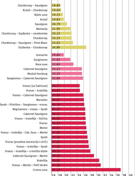 Prosječni sadržaj ukupnog ekstrakta (g/l) u crnogorskim bijelim, roze i crvenim suvim vinima