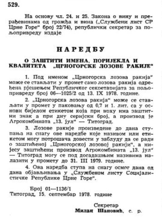 Naredba o zaštiti imena, porijekla i kvaliteta „Crnogorske lozove rakije”, 1978.