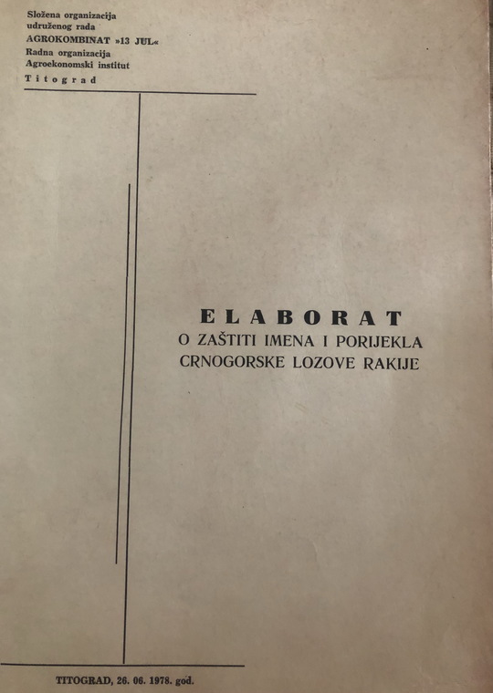 Elaborat o zaštiti imena i porijekla Crnogorske lozove rakije, 1978.