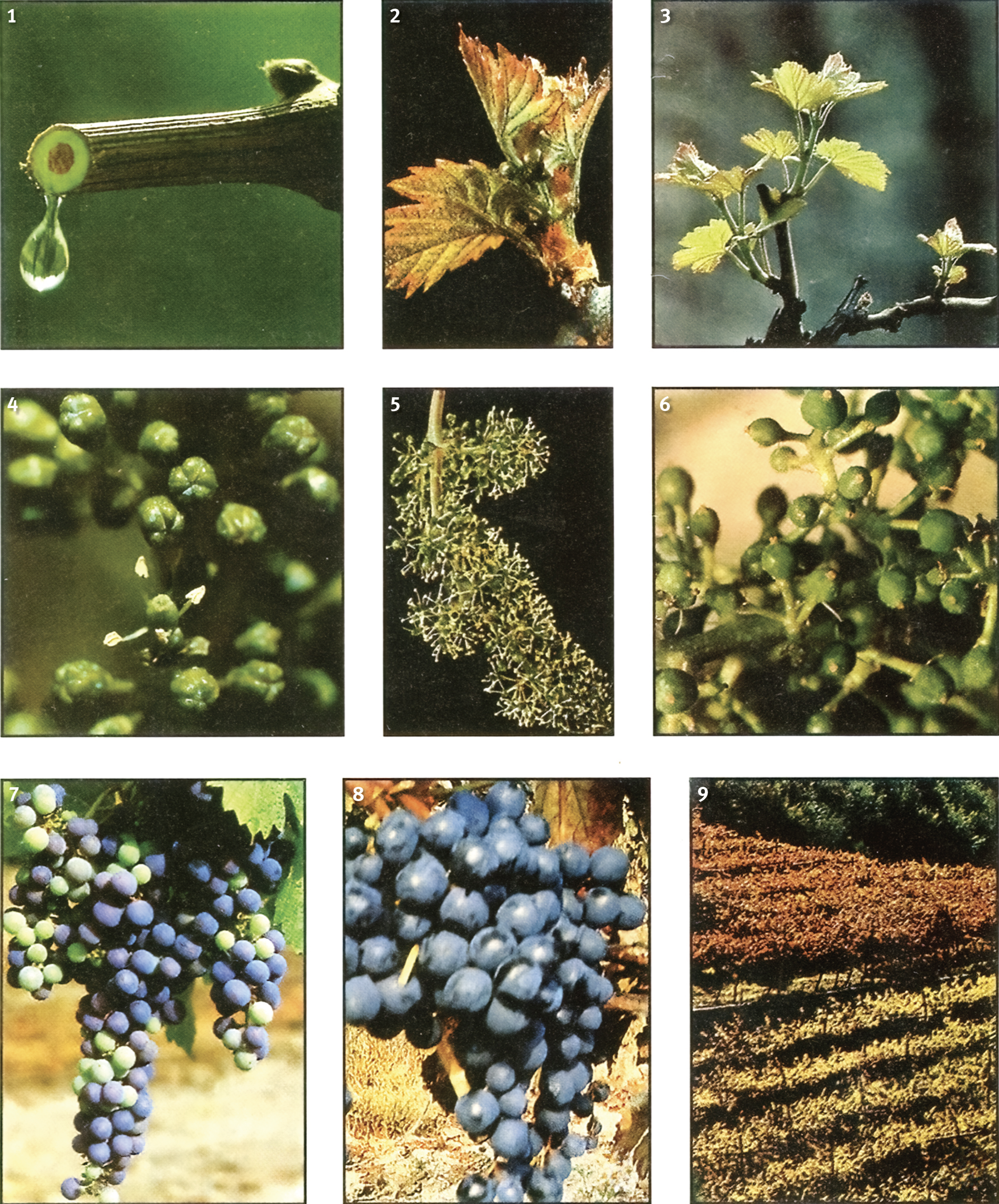 Fenofaze razvića vinove loze: suzenje (1), kretanje okaca (2, 3), cvjetanje (4, 5), rast zelenih bobica (6), sazrijevanje grožđa (7, 8), sazrijevanje lastara (9)