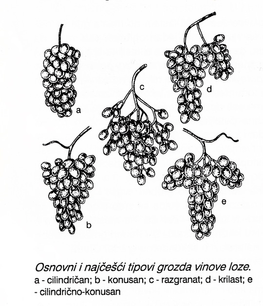 Najčešći tipovi grozda: a) cilindričan, b) konusan, c) razgranat, d) krilast, e) cilindrično-konusan.