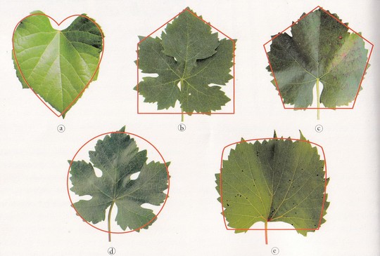 Različiti oblici listova vinove loze: a) srcast, b) klinast, c) pentagonalan, d) okrugao, e) bubrežast