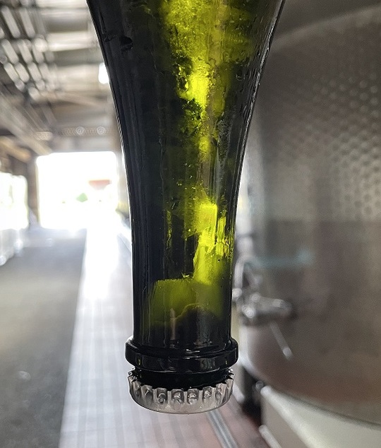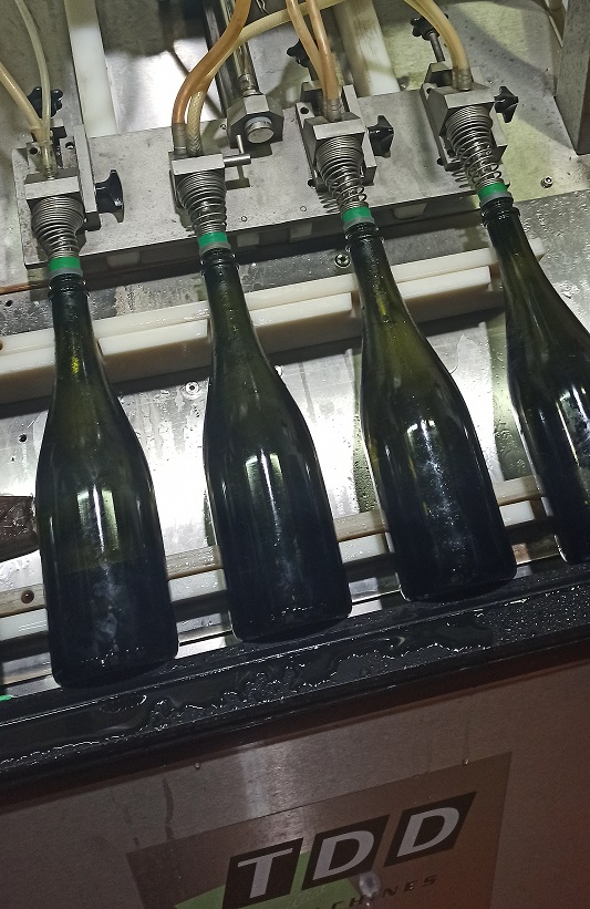 Vino potom odležava na talogu radi dobijanja bolje teksture. Nakon toga slijedi ridling, tj. okretanje flaše poslije određenog vremena. Spuštanje sedimenta u grlo flaše postiže se njenim ručnim okretanjem ili automatskim okretačima. Po završetku ove faze, flaše se mogu ostaviti nekoliko nedjelja u položaju okrenutom grlom nadolje kako bi se sediment za otklanjanje bolje pripremio. Kada se talog u potpunosti spusti, slijedi faza degoržiranja, odnosno uklanjanja nastalog taloga. Za degoržiranje je neophodno prvo rashladiti flaše na 7°C, a potom grlo flaše potopiti u ledeni rastvor (CaCl2 ili rastvor glikola na –20°C). Na ovaj način postiže se brzo zamrzavanje sedimenta u flaši. Hlađenje povećava rastvorljivost ugljen-dioksida i smanjuje vjerovatnoću većeg izlivanja vina nakon otvaranja. Zamrzavanje sedimenta kvasca u vratu flaše značajno olakšava njegovo izbacivanje. Sediment se brzo zamrzne u rashladnom uređaju, a flaša se brzo transportuje do mašine za odvajanje čepa. U tom brzom procesu, mašina za odvajanje okreće flašu, uklanja poklopac, omogućavajući izbacivanje smrznutog čepa. Nakon toga slijedi prilagođavanje nivoa vina željenoj zapremini. Tom prilikom najčešće se dodaje ekspedicioni liker, kojim se definiše sadržaj šećera u finalnom pjenušavom vinu, balansira kiselost i, samim tim, poboljšava finalni ukus. Ekspedicioni liker se u nekim slučajevima ne dodaje, i to kada je u pitanju proizvodnja brut nature pjenušavog vina (manje od 3 g šećera), koje je izbalansirano i harmonično kada je potpuno suvo. Sadržaj šećera u ekspedicionom likeru zavisi od kategorije pjenušavog vina koja se želi postići, kao i od zaostalog šećera u flaši nakon sekundarne alkoholne fermentacije. Nakon korigovanja nivoa vina u flaši i dodavanja ekspedicionog likera, flaše se zatvaraju posebnim čepovima (obično dijametra 31 mm i 48 mm dužine), čije je tijelo od presovane plute povezano sa dva diska od prirodne plute. Kada se plutani čep ubaci, a neposredno prije stavljanja žice, gornjih 10 mm čepa se sabija u zaobljeni oblik. Nakon stavljanja i pričvršćivanja žice, neophodno je flašu promiješati radi homogenizacije ekspedicionog likera u vinu. Potom se flaširano pjenušavo vino čuva od jednog do tri mjeseca, nakon čega slijedi etiketiranje.