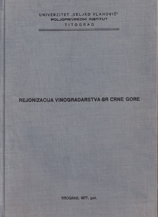 Rejonizacija vinogradarstva SR Crne Gore 1977. godine. Komisija Republičkog sekretarijata za poljoprivredu SR Crne Gore prihvatila je izradu prijedloga rejonizacije po metodici koju je razvila Međurepubličko-pokrajinska komisija za rejonizaciju vinogradarstva i izradu vinogradarskog katastra u SFRJ 1975. godine. Članovi komisije bili su: → Marko Ulićević, → Svetozar Pejović, Milutin Kostić, Gavro Spahić i → Nikola Petrović. Elaborat o rejonizaciji uradio je → Poljoprivredni institut u Titogradu, pod rukovodstvom → Predraga Vuksanovića. Saradnici na projektu bili su: Svetozar Pejović, → Vasilije Ćetković, → Ljubomir Pejović (Zavod za vinogradarstvo i voćarstvo Poljoprivrednog instituta), Dušan Ivezić (Hidrometeorološki zavod) i Pavle Samardžić (Zavod za proučavanje zemljišta). Tehnički saradnici bili su: Dragomir Lakić, Božidar Marković i Ilija Marićević. U izradi elaborata učestvovali su i → Jakša Pavićević i → Danilo Spaić iz OOUR-a „Plantaže” (→ Agrokombinat „13. jul” ). Rejonizacija je usvojena 1977. godine. Izdvojen je Crnogorski vinogradarski region, površine 1.906 ha, koji se sastojao od Crnogorsko primorskog i Titogradskog vinogorja. U državnom vlasništvu bilo je 796 ha vinograda (41,8%), a u privatnom 1.110 ha (58,2%). Od ukupne površine pod vinogradima, pod → vinskim sortama bilo je 1.515 ha (79,49%), a pod → stonim sortama 391 ha (20%). Od 796 ha vinograda u društvenom vlasništvu, pod vinskim sortama na 598 ha (75,15%), dominirale su crne vinske sorte na 571 ha (95,52% ): vranac (85%) i kratošija (10%), dok su se bijele vinske sorte gajile na 27 ha (4,48%): bijeli krstač (90%) i žilavka (10%). Pod stonim sortama u društvenom vlasništvu bilo je 198 ha (24,85%), sa dominantnim sortama → kardinal, → kraljica vinograda i afus ali. Od 1.110 ha pod vinogradima u privatnom vlasništvu, pod vinskim sortama na 917 ha (82,6%), dominirale su crne vinske sorte na 882 ha (96,20%): kratošija (48%) i vranac (40%). Od bijelih vinskih sorti, na površini od 35 ha (3,80%), dominirale su sorte bijeli krstač (70%) i žižak (5%), dok su ostale bijele sorte (→ muškaćela, žilavka i dr.) bile zastupljene 25%. Stone sorte su se gajile na 193 ha (7,40%): razaklija (70%), kraljica vinograda i muskat hamburg. Unutar regiona izdvojen je i poseban lokalitet oaza Nudo. Rejonizacija vinogradarskih područja Crne Gore iz 1977. bila je polazna osnova za izradu nove rejonizacije 2017. godine.