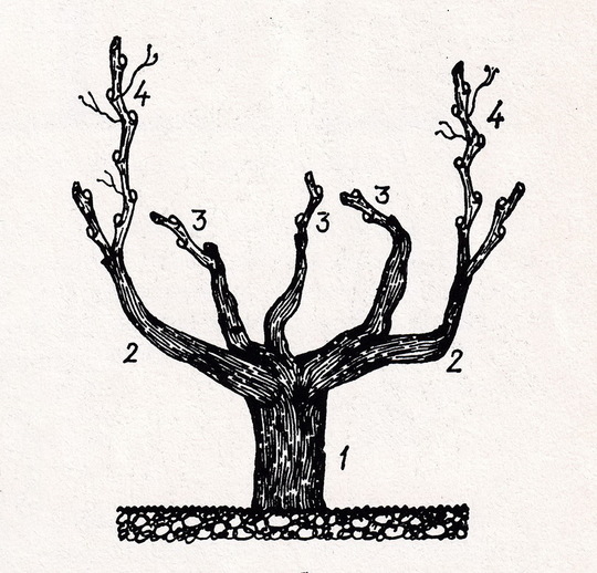 Stablo vinove loze i njegovi djelovi: 1 − stablo (deblo), 2 − krak čokota, 3 − kondir, 4 − lastar