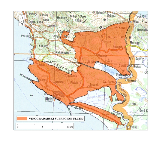 Preporučene i dozvoljene sorte. → Vinske sorte za proizvodnju vina, sa → oznakom geografskog porijekla i → oznakom porijekla za subregion Ulcinj su: vinske sorte s obojenom → pokožicom (→ vranac, → kratošija, game, → grenaš crni, → alikant buše, frankovka, → kaberne sovinjon, → kaberne fran, → lisica, → merlo, muskat hamburg, plavka, prokupac, → sirah, lokalne sorte i dr.), bijele vinske sorte (→ bijeli krstač, graševina, → muškaćela i drugi muskati, → burgundac bijeli, pino sivi, → smederevka, → sovinjon, → šardone, → župljanka, → žižak, → žilavka), domaće novostvorene, nove registrovane, kao i druge lokalne i → autohtone sorte (→ Preporučene i dozvoljene sorte). Vodeća sorta subregiona je vranac, u kojem 85,71% proizvođača gaji ovu sortu. Sortu kratošija gaji više od dvije trećine proizvođača. Vinogradi za komercijalnu proizvodnju grožđa i vina nalaze se uglavnom u okviru Briskog i Zoganjskog polja, u KO: Darza, Reč, Bratica, kao i u dolini Međuriječke rijeke, na nadmorskim visinama do 100 m.