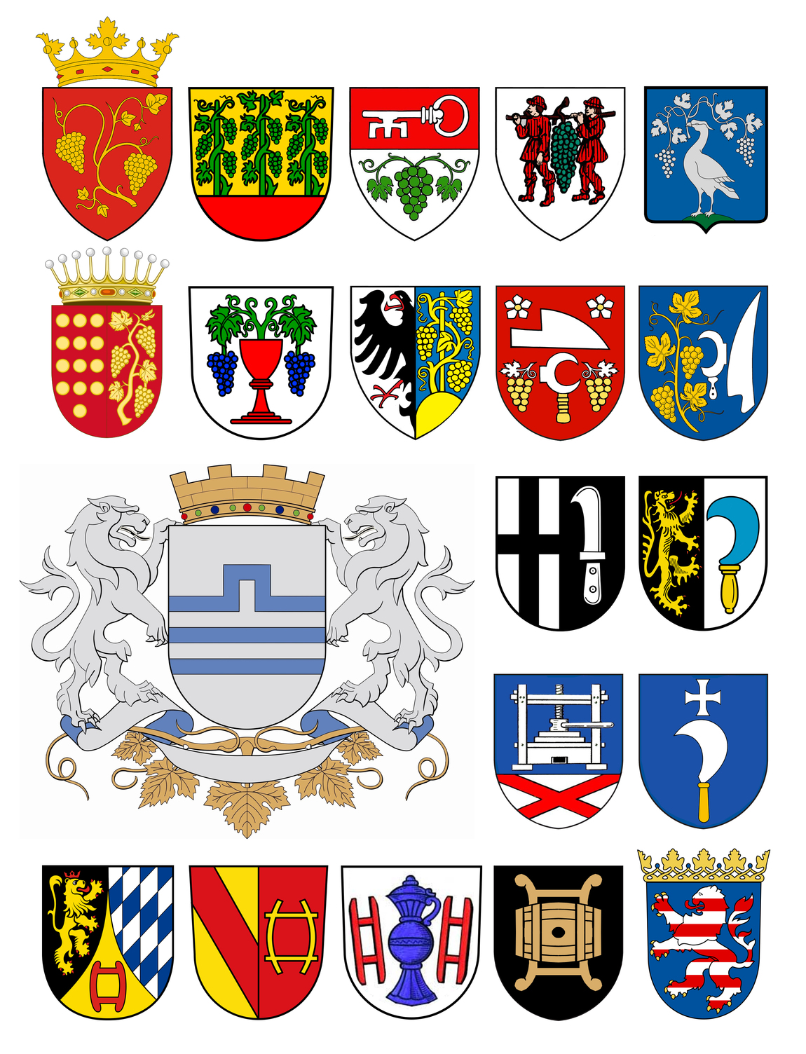 Prikaz evropskih municipalnih grbova sa motivima vinove loze i vinogradarske djelatnosti, uključujući i grb Podgorice
