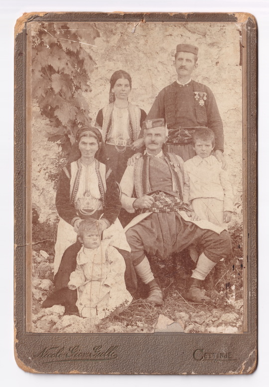 Crnogorska porodica ispred kuće sa vinovom lozom, 1886, fotograf Nikola Đonović