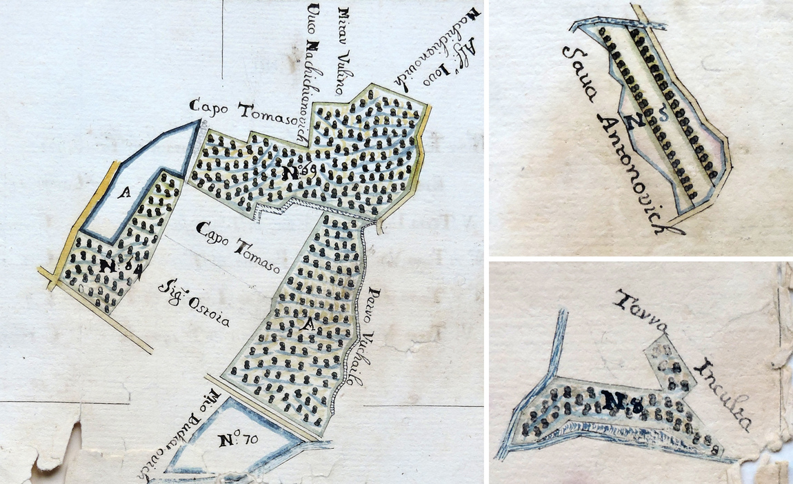 Prikaz elemenata kulturnog pejzaža – dolci u suvozidu, sa špalirima vinove loze: Venecijanski katastar Herceg Novog (Catastico di Castelnuovo), Venecija, 1704.