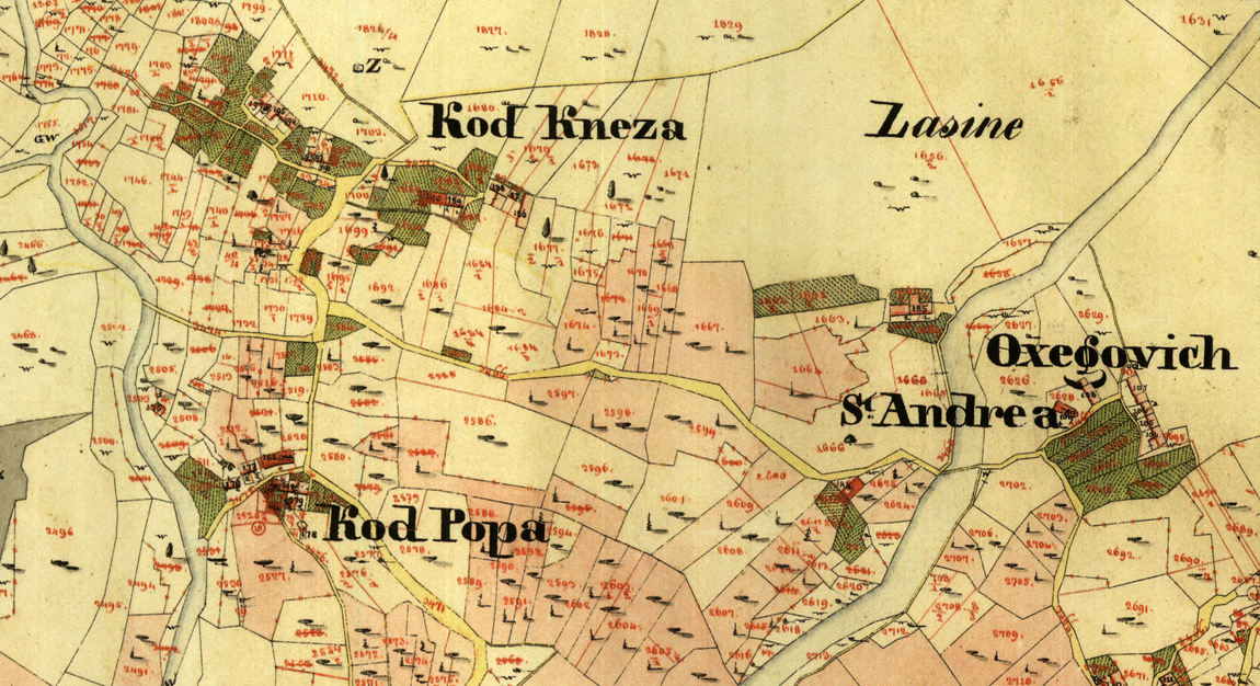 Prikaz elemenata kulturnog pejzaža – imanja sa zasadima vinove loze, grafički simbol pritke i puzeće vinove loze: Katastar Franca I, područje Herceg Novog (Catastico di Castelnuovo), Beč, 1837.