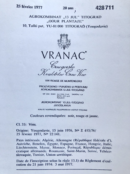 Sertifikat međunarodne zaštite žiga „Vranac − crnogorsko kvalitetno crno vino”, br. 428711, Svjetska organizacija za intelektualnu svojinu, 1977.