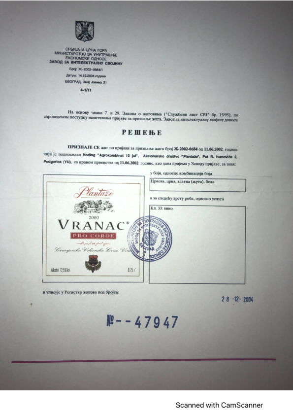 Zaštita žiga za vino „Vranac Pro Corde”, br. 47947, Zavod za intelektualnu svojinu Ministarstva za unutrašnje ekonomske odnose SCG, 2004.
