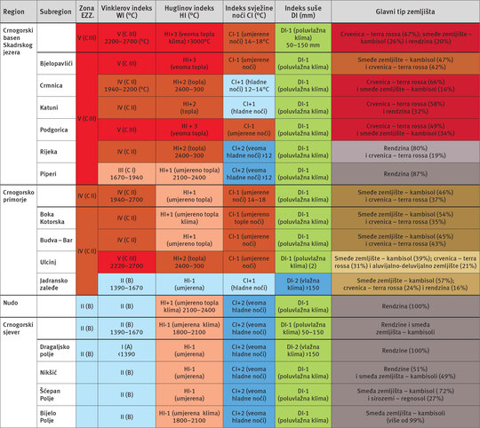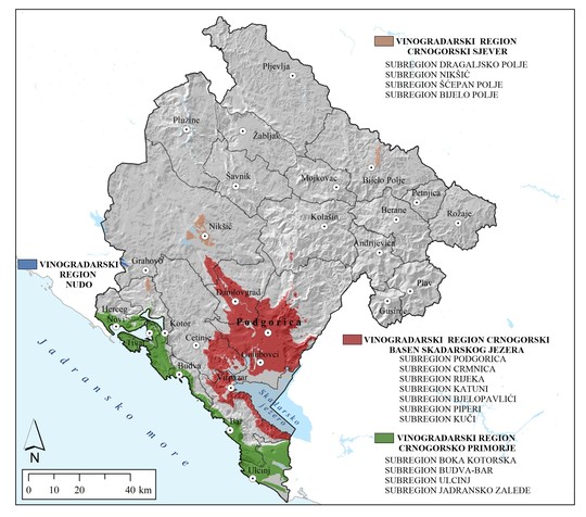 Crnogorski vinogradarski regioni i subregioni, vinogradarska geografska proizvodna područja. → Rejonizacijom vinogradarskih geografskih proizvodnih područja Crne Gore (2017) i Odlukom Vlade Crne Gore o određivanju regiona za proizvodnju vina (2017), izvršena je podjela na četiri → vinogradarska regiona (rejona) i 15 → vinogradarskih subregiona (podregiona/vinogorja) . To su: 1. → vinogradarski region (rejon) Crnogorski basen Skadarskog jezera (sa subregionima: → vinogradarski subregion (podregion/vinogorje) Kuči , → vinogradarski subregion (podregion/vinogorje) Crmnica, → vinogradarski subregion (podregion/vinogorje) Rijeka, → vinogradarski subregion (podregion/vinogorje) Podgorica, → vinogradarski subregion (podregion/vinogorje) Piperi, → vinogradarski subregion (podregion/vinogorje) Katuni i → vinogradarski subregion (podregion/vinogorje) Bjelopavlići); 2. → vinogradarski region (rejon) Crnogorsko primorje (sa subregionima: → vinogradarski subregion (podregion/vinogorje) Boka Kotorska, → vinogradarski subregion (podregion/vinogorje) Budva – Bar, → vinogradarski subregion (podregion/vinogorje) Ulcinj i → vinogradarski subregion (podregion/vinogorje) Jadransko zaleđe); 3. → vinogradarski region (rejon) Nudo; 4. → vinogradarski region (rejon) Crnogorski sjever (sa subregionima: → vinogradarski subregion (podregion/vinogorje) Dragaljsko polje, → vinogradarski subregion (podregion/vinogorje) Nikšić, → vinogradarski subregion (podregion/vinogorje) Šćepan Polje i → vinogradarski subregion (podregion/vinogorje) Bijelo Polje). Po vrijednostima Vinklerovog indeksa (WI), vinogradarski regioni nalaze se u pet različitih klimatskih zona za proizvodnju grožđa i vina. Najveći dio pripada IV i V zoni (WI je iznad 1.940ºC), a postoje i toplotni uslovi za gajenje vinove loze i u hladnijim oblastima regiona Nudo i Crnogorski sjever, koji pripadaju klimatskoj zoni II (WI je 1.391–1.670ºC). Vinogradarska geografska područja Crne Gore označena su i, po EEZ klasifikaciji, velikim slovima A, B, CI, CII , CIII. Zonama A i B pripadaju sjeverna vinogradarska područja (Nudo i Crnogorski sjever), a zonama CI, CII, CIII južna (Crnogorski basen Skadarskog jezera i Crnogorsko primorje). U vinogradarskim područjima zastupljeni su različiti tipovi zemljišta.