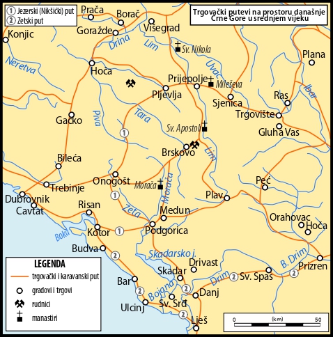 Kroz teritoriju današnje Crne Gore prolazile su dvije značajne putne trase. Iz Kotora je polazio Jezerski put (Via Jesera), koji je dolazio najprije do Risna, odakle se zatim stizalo do Grahova i Onogošta (Anagastum, današnji Nikšić). Zbog toga je ova trasa u izvorima bila poznata i kao Via Anagasti ili Nikšićki put, dok je sam Onogošt predstavljao važnu raskrsnicu puteva. Glavni dio trase Jezerskog puta je od Onogošta išao na Šavnik i dalje preko oblasti Jezera (polje na 1.460 m nadmorske visine) i Drobnjaka do Breznice, koja se od XV vijeka naziva Pljevlja. U Nikšiću se Jezerski put ukrštao sa sporednim krakom Drinskog puta (Via Drinae), koji je iz Dubrovnika skretao u Trebinje, dok je od Onogošta ova saobraćajnica išla dolinom Zete do Podgorice, odakle je nastavljala do Skadra. Jedan krak puta vodio je od Meduna (nekadašnji grad, 13 km sjeveroistočno od Podgorice) do Gusinja i Plava. Odatle se preko Budimlje (kod današnjih Berana) pristizalo u Srednje Polimlje, dok se preko Čakora dolazilo u Metohiju, tačnije do Peći i Manastira Dečani. Od Nikšića do rudnika Brskovo na Tari (rudarski grad kod današnjeg Mojkovca) – značajnog trgovačkog naselja, gdje su Dubrovčani i Kotorani izvozili velike količine vina, dolazilo se preko Župe, Manastira Morače i Kolašina. Istim pravcem išli su i karavani koji su iz Kotora prenosili vino do Brskova. Glavna trasa Drinskog puta, koja je polazila iz Dubrovnika, skretala je od Foče ka Pljevljima, nastavljajući do Prijepolja, odakle se dolazilo u Brskovo. Putevi su od Brskova vodili ka Prijepolju, kao i do Plava, Peći i drugih krajeva Metohije.