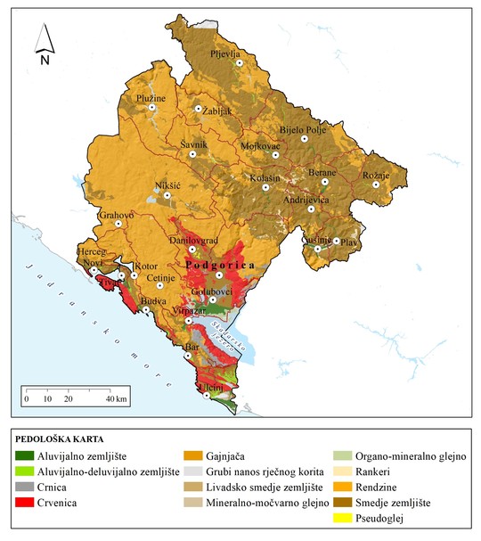 Zemljišni uslovi vinogradarskih područja, osobine zemljišta koje utiču na gajenje vinove loze. Najveći uticaj na rast loze, visinu prinosa i kvalitet grožđa i vina ima tip zemljišta, fizičke osobine (mehanički sastav zemljišta, toplotni, vodni i vazdušni režim, struktura i boja zemljišta) i hemijski sastav zemljišta. Zemljište je supstrat, podloga, koja → vinovoj lozi služi kao oslonac za učvršćenje, izvor mineralne hrane, regulator vodnog, vazdušnog i toplotnog režima, sredina za život i djelovanje mikroorganizama, koji svojom aktivnošću doprinose stvaranju mineralne hrane neophodne za život biljke. Ista sorta u identičnim mikroklimatskim uslovima daje različite rezultate u zavisnosti od osobina zemljišta na kojima se gaji. U zavisnosti od osobina zemljišta, sorte → evropske loze reaguju svojim rastom, → bujnošću čokota, rodnošću, visinom prinosa, kvalitetom grožđa i vina. Iz tog razloga se, pored → klimatskih uslova vinogradarskih područja , ispituju topografski i zemljišni uslovi u cilju definisanja → preporučenih i dozvoljenih sorti vinove loze za gajenje, u kojima će sorte ispoljiti svoje pozitivne agrobiološke i privredno-tehnološke karakteristike. Kao osnova za ispitivanje zemljišta za potrebe → rejonizacije vinogradarskih geografskih proizvodnih područja Crne Gore poslužila je pedološka karta zemljišta Crne Gore, razmjere 1 : 50.000, → Zavoda za unapređivanje poljoprivrede u Titogradu. Ova karta je bila osnov za određivanje tipova zemljišta vinogradarskih geografskih proizvodnih područja Crne Gore. Pored toga, na nivou ispitivanih vinogradarskih parcela u reprezentativnim teroarima, kroz rejonizaciju vinogradarskih područja (2017), urađeno je dodatno ispitivanje zemljišta, otvoreni pedološki profili i izvršeno određivanje klasifikacionih nivoa zemljišta. Vinogradarska područja Crne Gore imaju različit pedološki sastav i u njima su zastupljeni različiti tipovi zemljišta na kojima vinova loza uspijeva i donosi stabilan i kvalitetan prinos grožđa i vina (→ Crnogorski vinogradarski regioni i subregioni). U → vinogradarskom regionu (rejonu) Crnogorski basen Skadarskog jezera zastupljeni tipovi zemljišta su: crvenica (46,59% ukupne površine regiona), smeđa zemljišta – kambisoli (25,81% ukupne površine regiona) i rendzine (19,27% ukupne površine). Zemljišta zastupljena na manjim površinama su: crnica – kalkomelanosol (4,40%), aluvijalno zemljište – fluvisol (2,23%), pseudoglej (0,52%), gajnjača (0,30%), aluvijalno-deluvijalno zemljište (0,24%), rankeri (0,18%), organo-mineralno glejno (0,16%), livadsko smeđe zemljište (0,14%), voda (0,09%), grubi nanos rječnog korita (0,04%), mineralno-močvarno glejno (0,03%). U → vinogradarskom regionu (rejonu) Crnogorsko primorje zastupljeni tipovi zemljišta su: smeđa zemljišta (45,64% cjelokupne površine regiona), crvenica (36,69% cjelokupne površine regiona), aluvijalno-deluvijalno zemljište (10,08%), aluvijalno zemljište (4,39%) i rendzine (2,63%). Na manjim površinama zastupljena su i zemljišta: deluvijalno (0,22%), mineralno-močvarno glejno (0,07%), crnica (0,6%), sirozemi (0,04%) i dr. U → vinogradarskom regionu (rejonu) Nudo rendzine su uglavnom zastupljene 100%. U → vinogradarskom regionu (rejonu) Crnogorski sjever smeđa zemljišta čine 51,21% ukupne površine regiona, rendzina je zastupljena na 47,72%, sirozemi na 0,86%, a aluvijalno-deluvijalno zemljište na 0,05% površine ovog regiona. Najzastupljeniji tip zemljišta u vinogradarskim područjima Crne Gore je crvenica. U vinogradarskom regionu Crnogorski basen Skadarskog jezera zastupljena je 46,59%, u vinogradarskom regionu Crnogorsko primorje 36,69%, dok u vinogradarskim regionima Crnogorski sjever i Nudo nije zastupljena. Ovaj tip zemljišta nastaje na tvrdim karbonatnim stijenama (krečnjacima i dolomitu). Pored matičnog supstrata, glavni faktori i procesi koji su doprinijeli formiranju crvenice su: klimatski uslovi, geološki procesi i biljni pokrivač. Karakteristična je po crvenoj boji, koja potiče od prisustva gvožđe oksida u zemljištu. Mehanički sastav i stabilna struktura crvenice omogućavaju relativno dobru drenažu, a time i lakšu obradu. Nije izrazito plodna zemlja, adekvatnom obradom i primjenom organskih đubriva povoljna je za rast i razvoj vinove loze i proizvodnju visokokvalitetnih vina. Drugi po zastupljenosti tip zemljišta je eutrični kambisol ili eutrično smeđe zemljište. U vinogradarskom regionu Crnogorski basen Skadarskog jezera zauzima 25,81% ukupne površine regiona, u vinogradarskom regionu Crnogorsko primorje 45,64%, a u vinogradarskom rejonu Crnogorski sjever 51,21% ukupne površine rejona. U vinogradarskom regionu Nudo nije zastupljen. U Crnoj Gori, ovaj tip zemljišta razvija se na različitim matičnim supstratima i pod uticajem različitih pedogenetskih faktora, te ima više podtipova i varijeteta, koji su zastupljeni u vinogradarskim regionima i subregionima: eutrično smeđe zemljište na jezerskim sedimentima, varijeteta tipično, lesivirano, vertično i pseudoglejno, zatim eutrično smeđe zemljište na aluvijalnom i koluvijalnom nanosu, sa varijetetima tipično i vertično, kao i eutrično smeđe zemljište na eocenskom flišu.