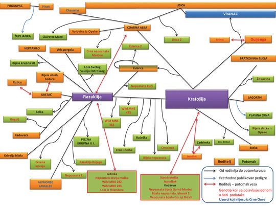 Pedigre crnogorskih sorti, analiza roditeljstva evropske i divlje loze u cilju utvrđivanja njihovog porijekla i nastanka. Genomske tehnologije su ključne za utvrđivanje genetske srodnosti između sorti i utvrđivanje pedigrea (→ Genetička identifikacija sorte). Rezultati istraživanja divlje i → evropske loze u Crnoj Gori 2020. potvrdili su da se crnogorsko vinogradarstvo bazira na porodici genetički povezanih sorti, koje imaju sličnu strukturu pedigrea sa sortama u tradicionalnim regionima za gajenje vinove loze i proizvodnju vina, kao što su vinski regioni Francuske (Bordo i Burgundija), u kojima su osnovne roditeljske sorte u pedigreu sorte → kaberne fran i pinot noar. Osnovne roditeljske sorte u Crnoj Gori su sorte → kratošija i → razaklija. Kratošija zauzima poseban status kao „majčinska” (osnovna) sorta. U istraživanjima iz 2020. otkriveno je 25 punih pedigrea (trios odnosa: majka, otac i potomak) i 27 duos odnosa (roditelj, potomak). Pronađen je puni pedigre sorte → vranac, koji je potomak sorti kratošija (muški roditelj) i → duljenga (ženski roditelj). Utvrđena je vodeća uloga sorti razaklija i kratošija u stvaranju crnogorskog genetičkog → diverziteta vinove loze. Sorta razaklija bila je roditelj u 14 pedigrea, dok je sorta kratošija bila roditelj u 12 pedigrea. Zajedno su imali šest potomaka: crna Tomba, raćeška, bijela nepoznata, → crna loza, uključujući i dva genotipa uzorkovana kao → divlja loza: divlja MNE 362 (lokalitet Orasi) i divlja MNE 475 (lokalitet Meterizi). Od 27 duosa, potvrđeno je šest kompatibilnih veza roditelja i potomaka za kratošiju i šest za razakliju, od kojih su dva genotipa uzorkovana kao → divlja loza (divlja MNE 282 i divlja MNE 285). Među ostalim otkrivenim trios odnosima su: razaklija x heptakilo = bijela krupna SR; razaklija x alfons lavale (→ ribijer) = razaklija Brijege; razaklija x alfons lavale = nepoznata 2; razaklija x krivalja bijela = crvena krivaja; razaklija x → bijeli krstač = → belka; razaklija x radovača = → gogolj; razaklija x vela pergola = → loza Sv. Vasilija Ostroškog; razaklija x → čubrica = nepoznata Kuči; kratošija x bratkovina bijela = žitkovina; kratošija x koarna alba = čubrica; kratošija x duljenga = vranac; kratošija x lagorti = plavina crna; kratošija x lagorti = bijela slatka iz Opeke; kratošija x → bioka = → crni krstač; koarna alba x → lisica = lisica 2; koarna alba x volovina iz Opeke = crna nepoznata Masline; prokupac x pino = → župljanka; koarna alba x → šasla = klaret mazel; čubrica x čubrica = čubrica 2. U okviru 27 pronađenih duos odnosa su: divlja MNE 275 (lokalitet Lesendro) – divlja MNE 276 (lokalitet Lesendro); divlja MNE 363 (lokalitet Orasi) – divlja MNE 364 (lokalitet Orasi); kratošija – stara kratošija; → čauš bijeli – čauš crveni; muskat a peti gran – muskat ruž de mader; kratošija – nepoznata bijela gornji Morinj; → zadrimka – → japudžak; kratošija – kadarun; koenigin der weingaerten – afus ali; kratošija – bijela nepoznata Jelenak 2; krstač – divlja MNE 252 (lokalitet Danilovgrad); ćelinac – duljenga; kratošija – nepoznata bijela gornji Brčeli; razaklija – loza iz Hilandara; razaklija – cetinka; kratošija – japudžak; angelo pirovano – muskat hamburg; silvaner gruen – savagnin; malvazija bjanka lunga – lagorti; krstač – ružica; razaklija – koarna alba; lagorti – sisak; → điritkinja – karištino; bijela sitnih bobica – krstač; razaklija – divlja MNE 285 (lokalitet Rijeka Crnojevića); razaklija – nepoznata divlja muška; razaklija – divlja MNE 282 (lokalitet Kamenik). Identifikovan je jedan gajeni genotip (čubrica 2) kao kompatibilni rezultat samoukrštanja sorte čubrica. Među divljom lozom nijesu pronađeni puni triosi, ali su otkrivena dva duosa u dvije različite populacije: divlja MNE 275 – divlja MNE 276 (u tvrđavi Lesendro) i divlja MNE 363 – divlja MNE 364 (lokalitet Orasi).