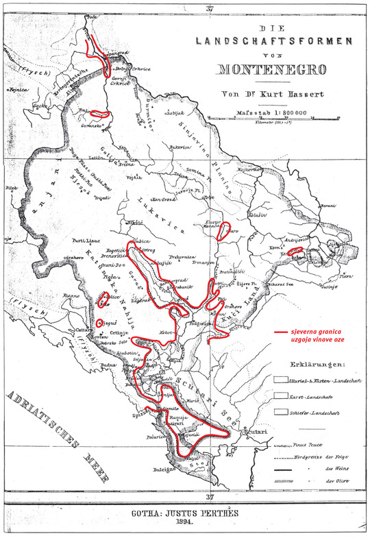Fotokopija pedološke karte Knjaževine Crne Gore, sa sjevernim granicama gajenja smokve, masline i vinove loze i staništima bora molike, Dr Kurt Hassert, 1894.