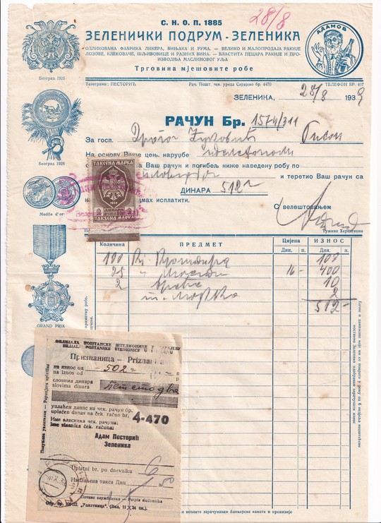 Račun sa logotipom firme „Zelenički podrum” i osvojenim nagradama za vina, trgovina mješovite robe, 1939.
