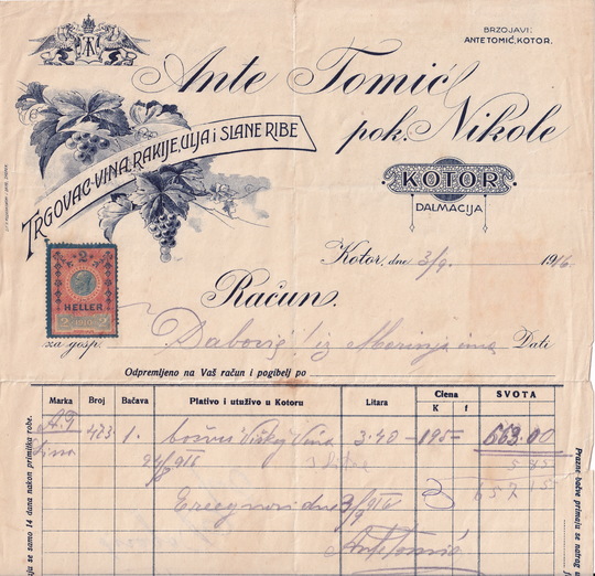 Račun firme i logotip, „Ante Tomić”, Kotor, 1916.