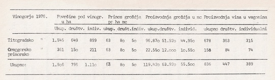 Ukupna proizvodnja grožđa u Crnogorskom vinogradarskom regionu u 1976. iznosila je 119.420 mc: u društvenom sektoru 63.920 mc (Titogradsko vinogorje 51.920 mc i Crnogorsko primorsko vinogorje 12.000 mc), u individualnom 55.500 mc (Titogradsko vinogorje 44.950, Crnogorsko primorsko vinogorje 10.550 mc). Najviše grožđa proizvodilo se u Titogradskom vinogorju, 96.870 mc (društveni sektor 51.920 mc i individualni 44.950 mc). Značajno manja proizvodnja grožđa bila je u Crnogorskom primorskom vinogorju, 22.550 mc (društveni sektor 12.000 mc i individualni sektor 10.550 mc). Ukupna proizvodnja vina u Crnogorskom vinogradarskom regionu iznosila je 836 vagona: u društvenom sektoru 447 (Titogradsko vinogorje 363 i Crnogorsko primorsko vinogorje 84), a u individualnom sektoru 389 vagona (Titogradsko vinogorje 315 i Crnogorsko primorsko vinogorje 74). Najveće količine proizvedenog vina bile su u Titogradskom vinogorju – 678 vagona (društveni sektor 363 i individualni sektor 315), dok se u Crnogorskom primorskom vinogorju proizvelo svega 158 vagona (društveni sektor 84 i individualni sektor 74).