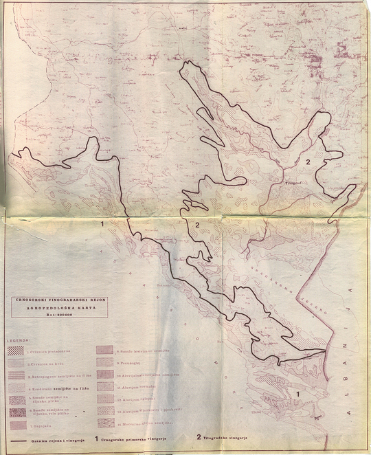 Površine pod vinovom lozom 1959. iznosile su 1.010 ha, od čega je u podrejonu Crnogorskog basena Skadarskog jezera bilo 620 h, a u podrejonu Crnogorskog primorja 390 ha. U sortimentu je dominirala sorta kratošija, koja je krajem XIX vijeka bila izrazito dominantna u svim nekalemljenim zasadima i vinogradima, čineći 90% sortimenta, te se smatrala glavnom i najstarijom crnogorskom sortom (→ Vinogradarstvo i vinarstvo u XIX vijeku).