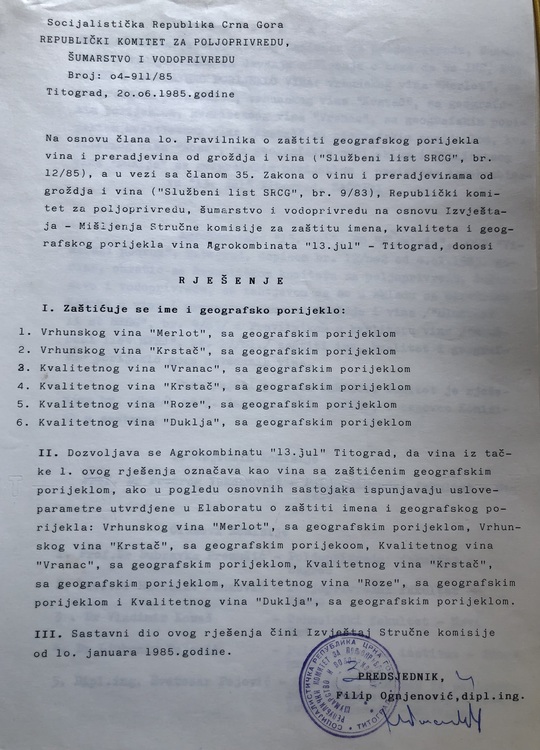Rješenje o zaštiti imena i geografskog porijekla za vina, 1985.