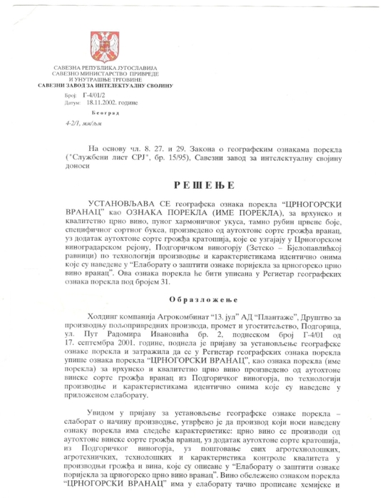 Oznaka porijekla za vino „Crnogoski vranac”, Savezni zavod za intelektualnu svojinu SRJ, 2002.