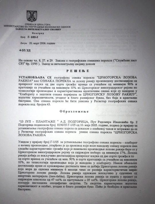 Oznaka porijekla „Crnogorska lozova rakija”, Zavod za intelektualnu svojinu Ministarstva za unutrašnje ekonomske odnose SCG, 2006.