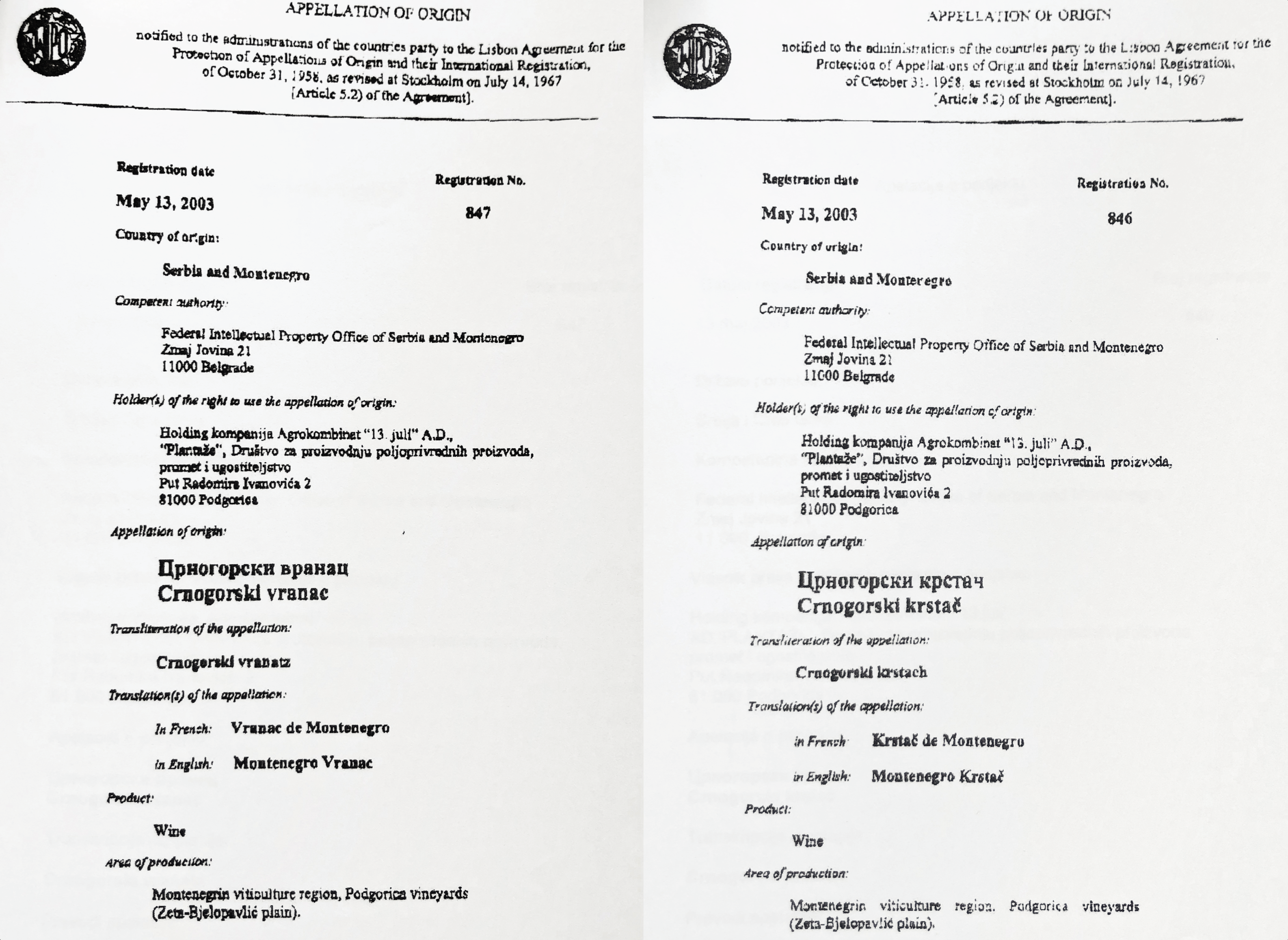 Sertifikat o međunarodnoj registraciji apelacije o porijeklu, br. 847, za vino „Crnogorski vranac”. Međunarodna zaštita kod Svjetske organizacije za intelektualnu svojinu (WIPO), 2003.