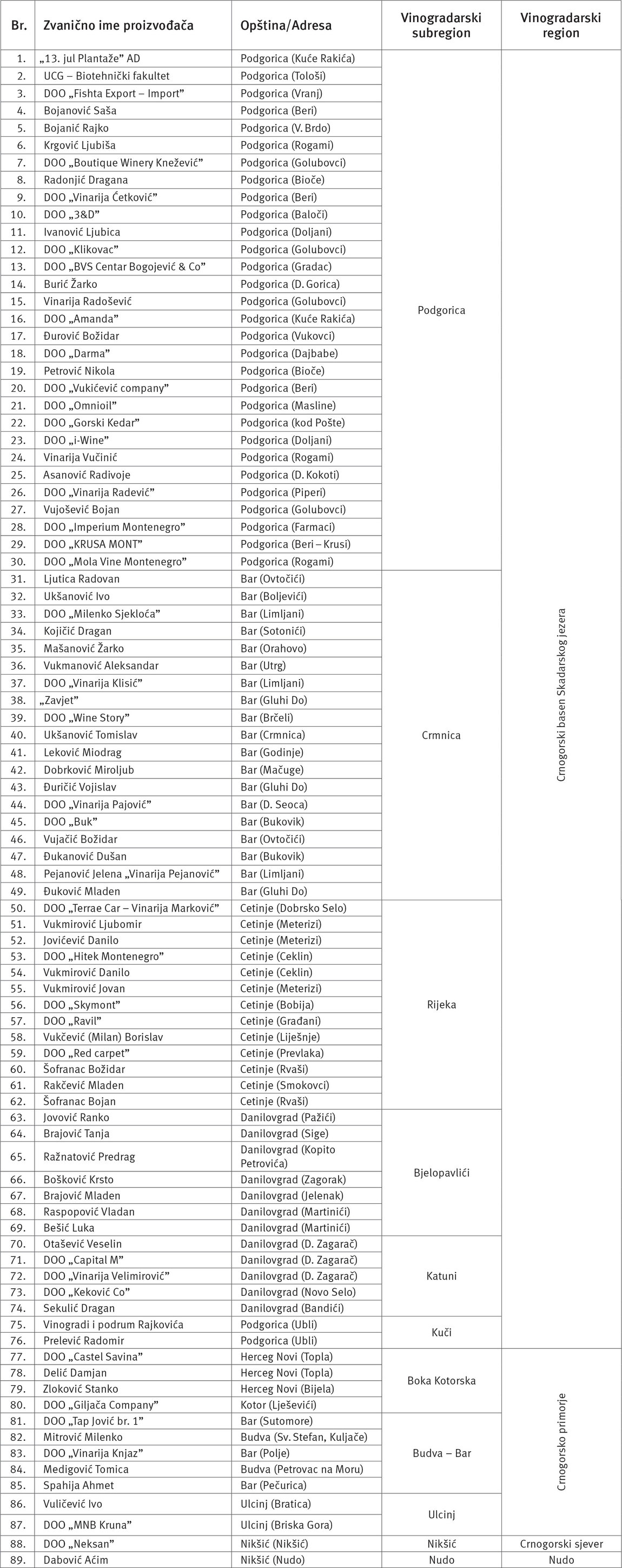 Prema subregionima, najveći broj vinarija nalazi se u → vinogradarskom subregionu (podregionu/vinogorju) Podgorica (32 vinarije, odnosno 36,36% u odnosu na ukupan broj upisanih vinarija) i u → vinogradarskom subregionu (podregionu/vinogorju) Crmnica (19 vinarija, odnosno 21,59% od ukupnog broja vinarija koje se vode u Vinogradarskom registru). Registrovani proizvođači vina su sljedeći: